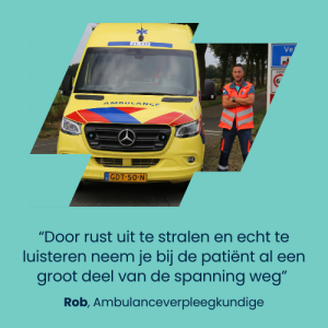 Na 13 jaar Defensie en een periode op de Spoedeisende Hulp (SEH) voelde Rob dat hij toe was aan een volgende stap. Als militair verpleegkundige bij Defensie deed Rob al ervaring op met prehospitale zorg: het stabiliseren en vervoeren van gewonde militairen naar een hospitaal of helikopter. “Dat was mijn eerste kennismaking met acute zorg buiten het ziekenhuis.” Op de SEH werd zijn interesse verder aangewakkerd. “Ik sprak daar vaak collega’s van de ambulance. Zij bleven maar zeggen: ‘Wanneer kom jij nou eens deze kant op?’ Hun enthousiasme werkte aanstekelijk.”